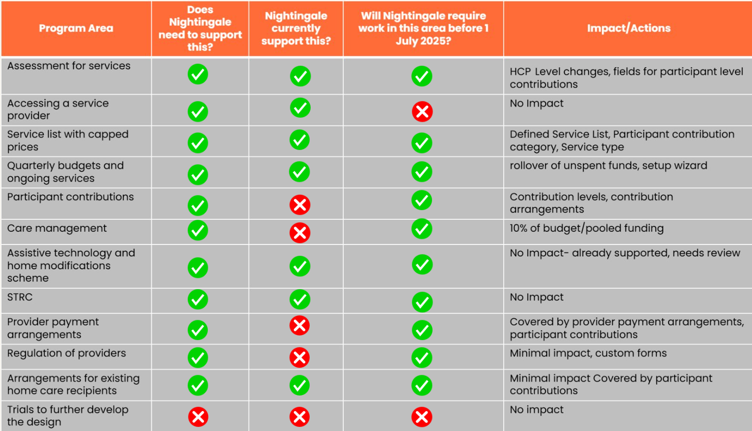 The new Support at Home program will replace the Home Care Packages Program and Short-Term Restorative Care Programme from 1 July 2025. We have identified the following work packages to be developed with the Nightingale Software and have commenced the technical design and development work. As a brief overview: