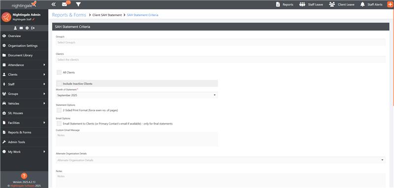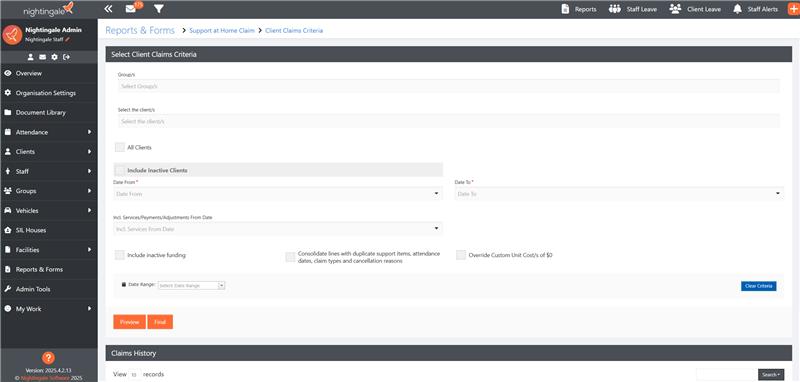 - Support at Home claims – development work for Support at Home claiming via CSV is also almost complete. A CSV file will be available to be generated, in the correct format to be submitted in the Aged Care Provider Portal. Once the claim is validated, a reconciliation report will be provided, which can be uploaded into Nightingale to reconcile the claim against services provided. Once this is complete, the participant contribution amounts will be available for invoicing. We will provide a sample of the CSV in the near future when it is available, but the following screenshot shows how to generate the claim, and the options that are available: