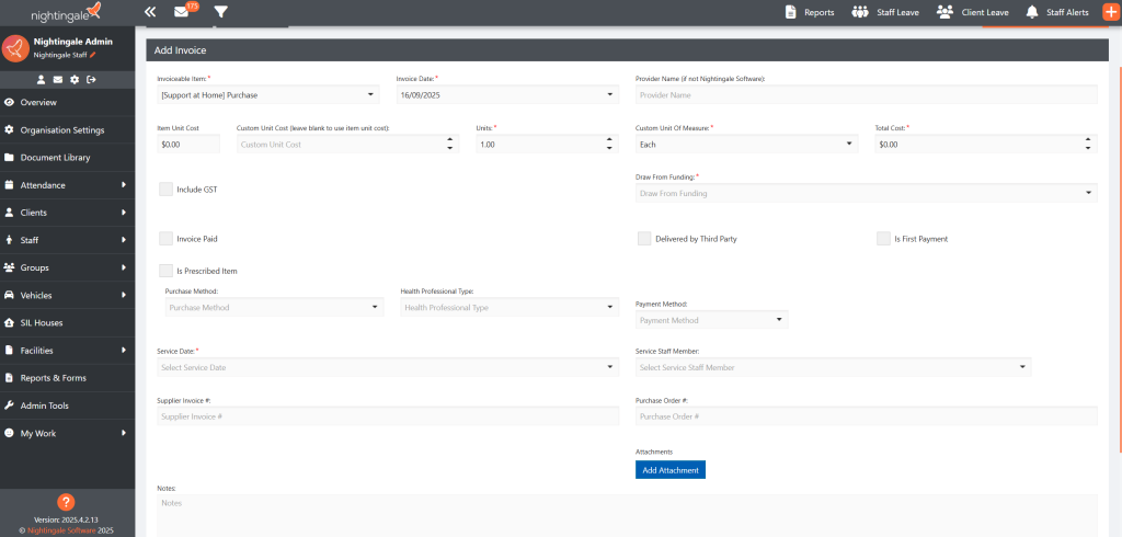 - Some services (such as those provided by a 3rd party) and products (such as those funded in the AT/HM scheme) require an invoice to be entered as evidence of the service or product provided. The following screenshot shows the process to add an invoice, with additional fields added to support all information required for a Support at Home claim: